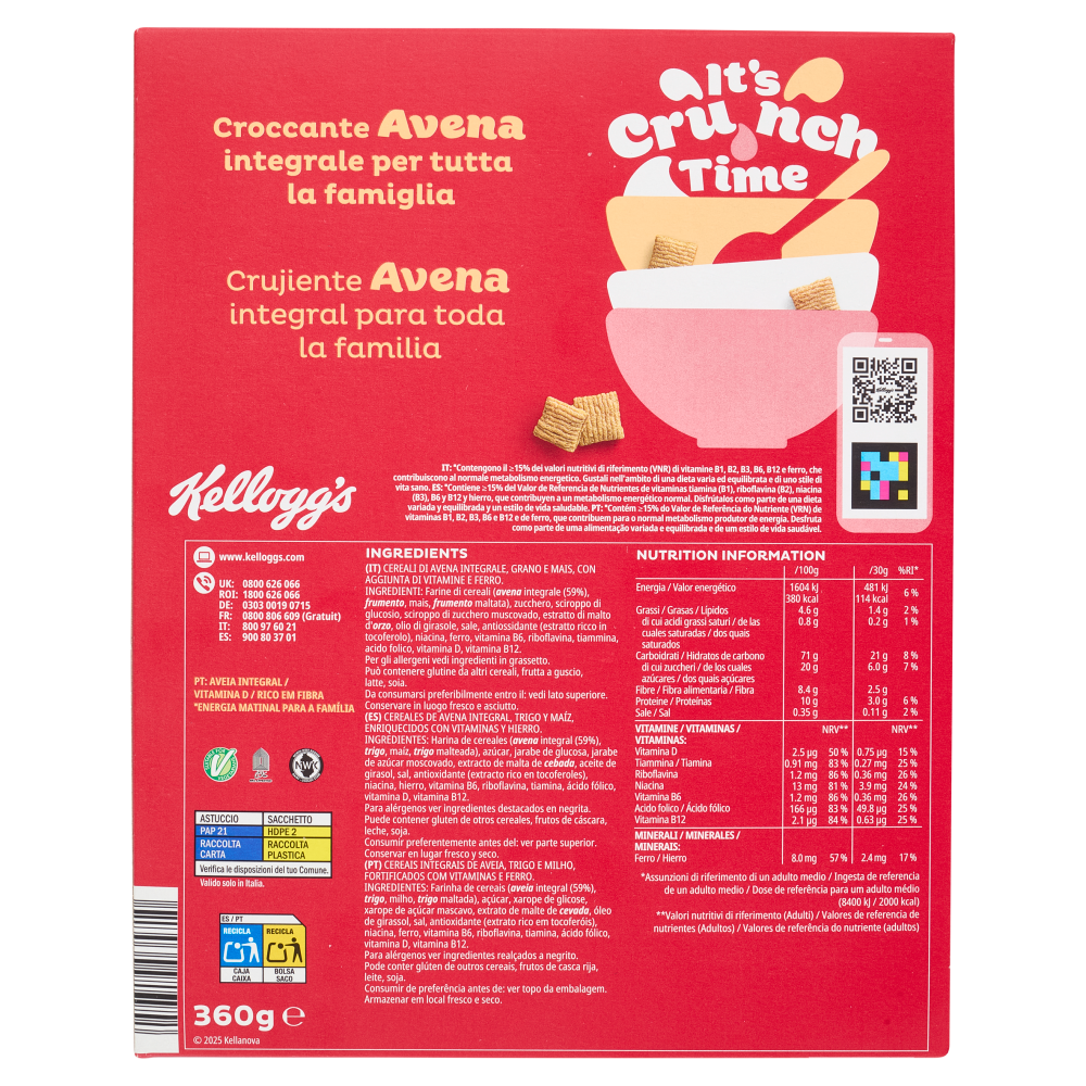Croccante Avena integrale per tutta la famiglia Avena integrale Vitamina D Ricco di fibre Inizia la giornata con un pieno di Energia* *Contengono il ≥15% dei valori nutritivi di riferimento (VNR) di vitamine B1, B2, B3, B6, B12 e ferro, che contribuiscono al normale metabolismo energetico. Gustali nell'ambito di una dieta varia ed equilibrata e di uno stile di vita sano.