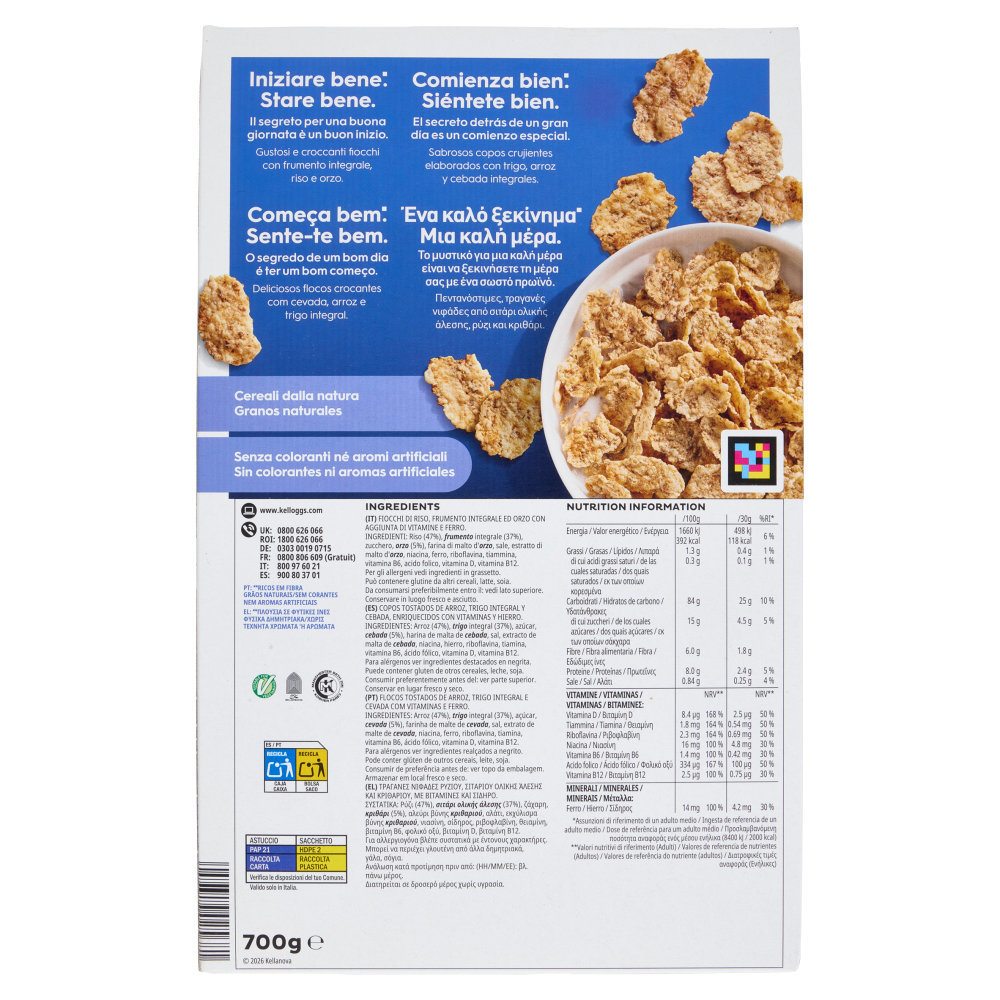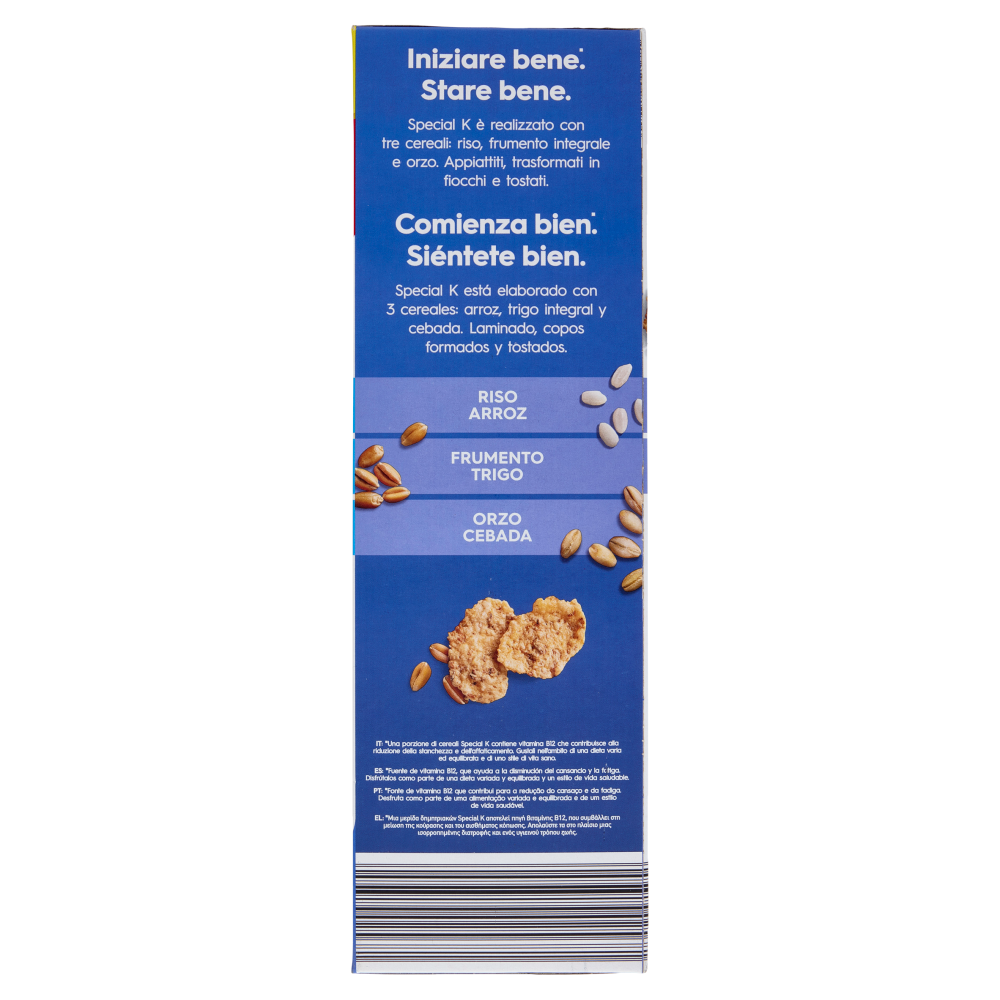 Iniziare bene*. Stare bene. Il segreto per una buona giornata è un buon inizio. Gustosi e croccanti fiocchi con frumento integrale, riso e orzo. Cereali dalla natura Senza coloranti né aromi artificiali Iniziare bene*. Stare bene. Special K è realizzato con tre cereali: riso, frumento integrale e orzo. Appiattiti, trasformati in fiocchi e tostati. *Una porzione di cereali Special K contiene vitamina B12 che contribuisce alla riduzione della stanchezza e dell'affaticamento. Gustali nell'ambito di una dieta varia ed equilibrata e uno stile di vita sano. Riso Frumento Orzo