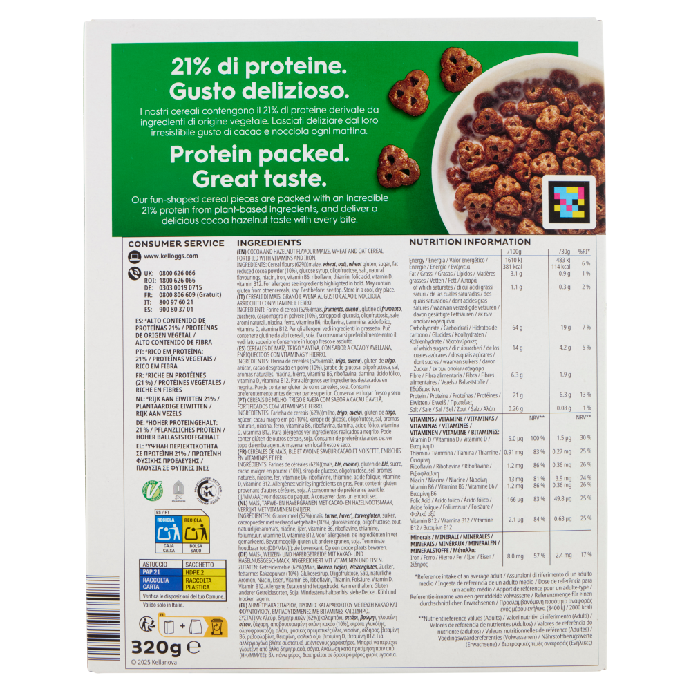 21% di proteine. Gusto delizioso. I nostri cereali contengono il 21% di proteine derivate da ingredienti di origine vegetale. Lasciati deliziare dal loro irresistibile gusto di cacao e nocciola ogni mattina. Alto contenuto di proteine 21% Proteine vegetali Ricco di fibre