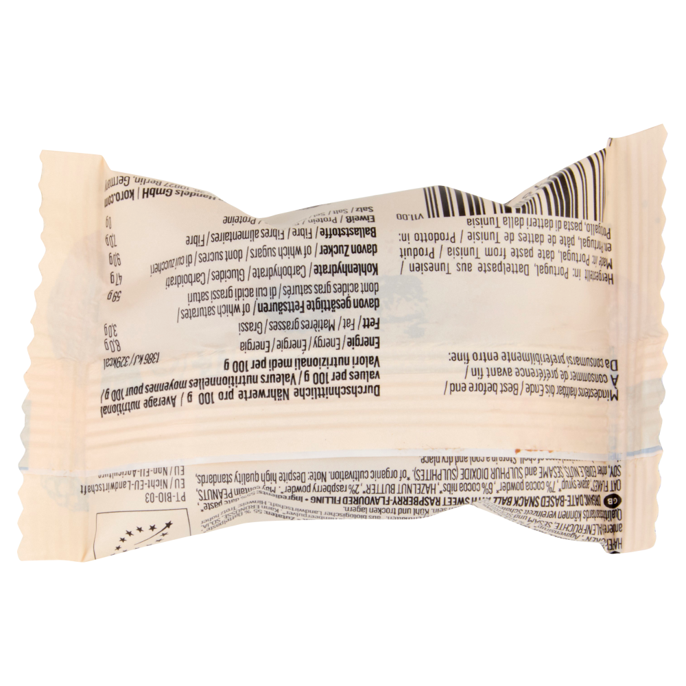 BiologicoPallina snack a base di datteri bio con un dolce ripieno al gusto di lampone