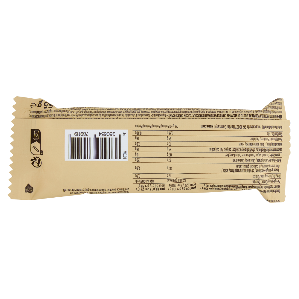 Adatto ai veganiBarretta proteica vegan al gusto di brownie con copertura di cioccolato. Con dolcificanti