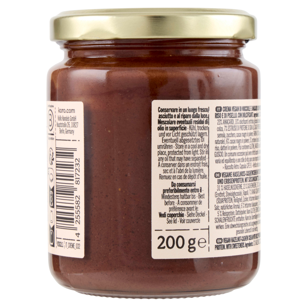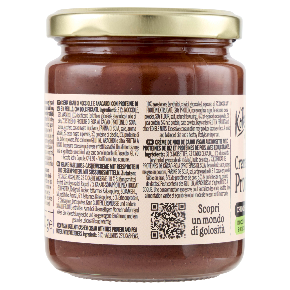 Adatto ai veganiCrema vegan di nocciole e anacardi con proteine di riso e di pisello. Con dolcificanti