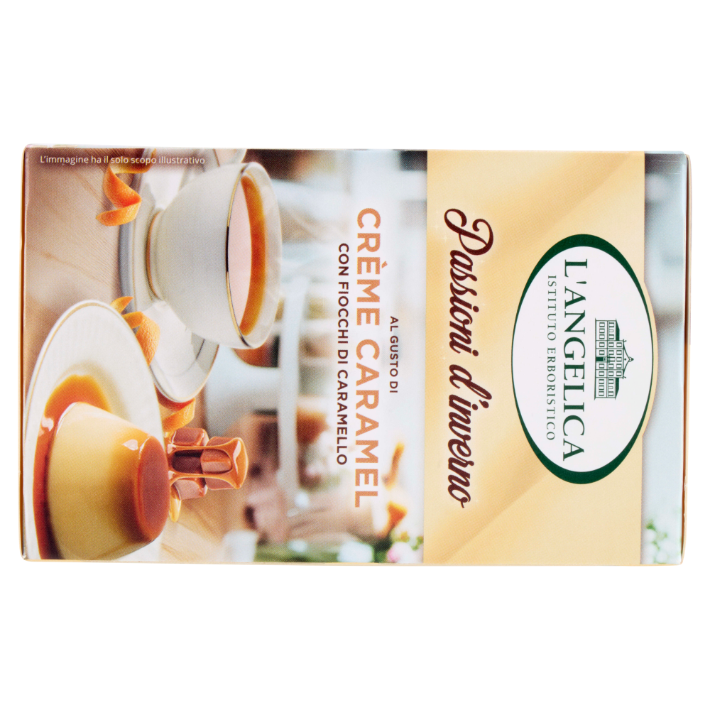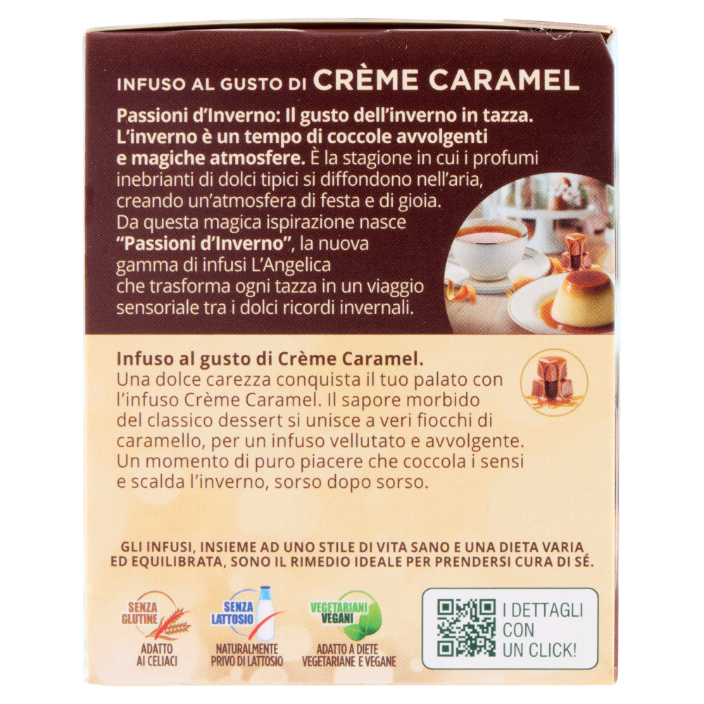 Infuso al gusto di Crème Caramel. Una dolce carezza conquista il tuo palato con l'infuso Crème Caramel. Il sapore morbido del classico dessert si unisce a veri fiocchi di caramello, per un infuso vellutato e avvolgente. Un momento di puro piacere che coccola i sensi e scalda l'inverno, sorso dopo sorso. Gli infusi, insieme ad uno stile di vita sano e una dieta varia ed equilibrata, sono il rimedio ideale per prendersi cura di sé. Senza glutine - Adatto ai celiaci Senza lattosio - Naturalmente privo di lattosio Vegetariani vegani - Adatto a diete vegetariane e vegane Ecoswell Progetto di sostenibilità L'Angelica per l'ambiente Nuovo astuccio, senza involucro per ridurre l'immissione nell'ambiente di 26 tonnellate di plastica ogni anno