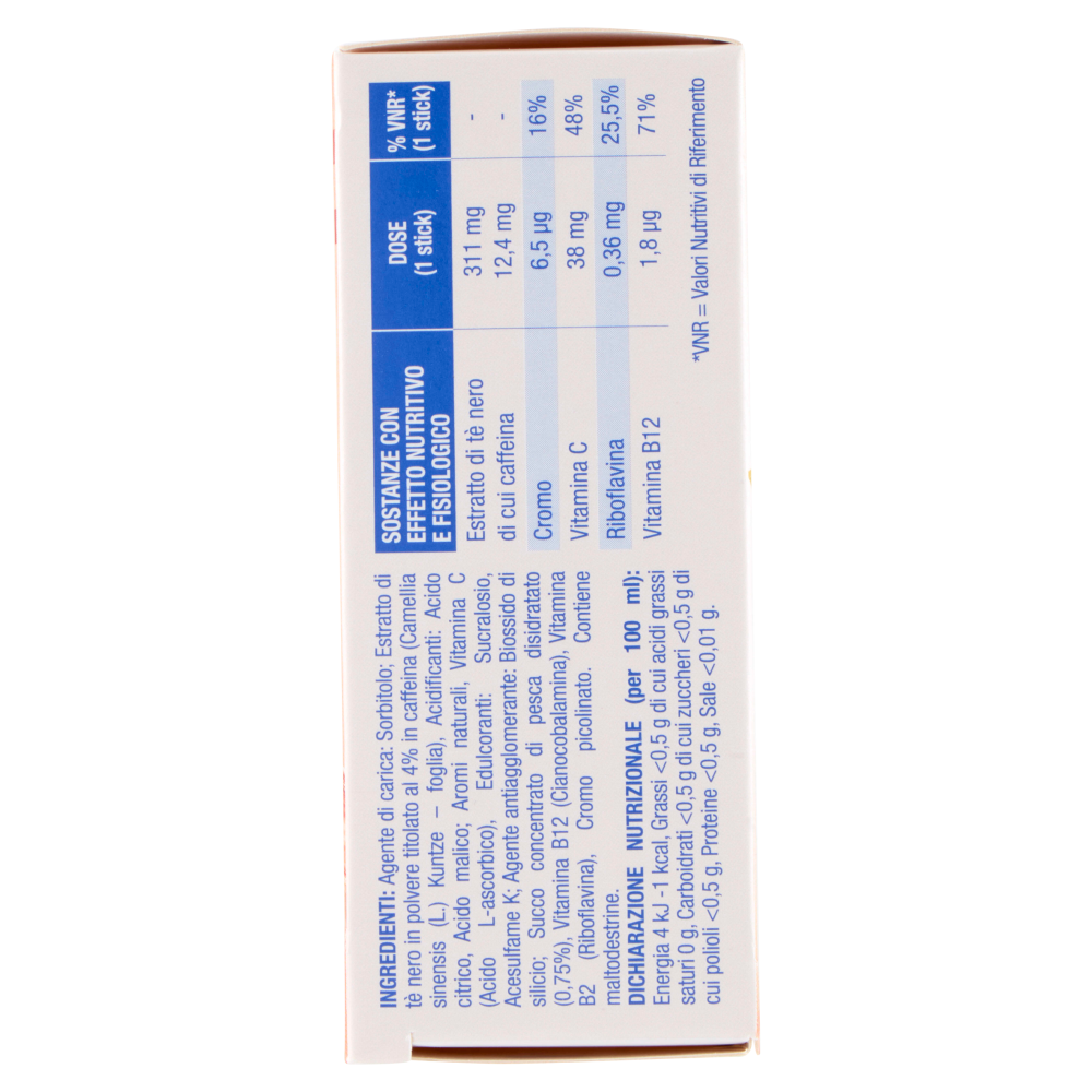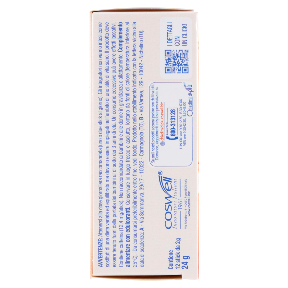 AVVERTENZE: Attenersi alla dose giornaliera raccomandata (uno o due stick al giorno). Gli integratori non vanno intesi come sostituti di una dieta variata ed equilibrata ma devono essere impiegati nell'ambito di uno stile di vita sano. Il prodotto deve essere tenuto fuori dalla portata dei bambini al di sotto dei 3 anni di età. Un consumo eccessivo può avere effetti lassativi. Contiene caffeina (12,4 mg/stick). Non raccomandato ai bambini e alle donne in gravidanza o allattamento.