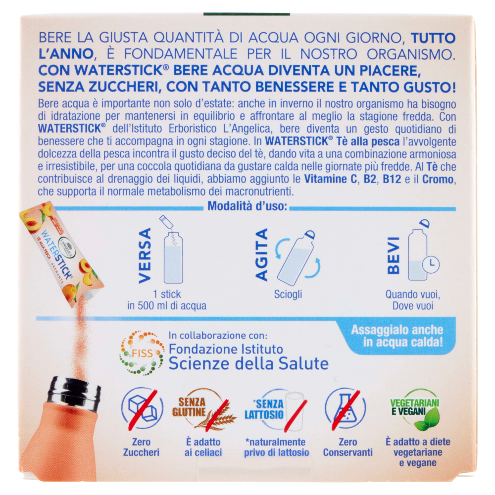 Bere la giusta quantità di acqua ogni giorno, tutto l'anno, è fondamentale per il nostro organismo. Con Waterstick bere acqua diventa un piacere, senza zuccheri, con tanto benessere e tanto gusto! Bere acqua è importante non solo d'estate: anche in inverno il nostro organismo ha bisogno di idratazione per mantenersi in equilibrio e affrontare al meglio la stagione fredda. Con Waterstick dell'Istituto Erboristico L'Angelica, bere diventa un gesto quotidiano di benessere che ti accompagna in ogni stagione. In Waterstick Tè alla pesca l'avvolgente dolcezza della pesca incontra il gusto deciso del tè, dando vita a una combinazione armoniosa e irresistibile, per una coccola quotidiana da gustare calda nelle giornate più fredde. Al Tè che contribuisce al drenaggio dei liquidi, abbiamo aggiunto le Vitamine C, B2, B12 e il Cromo, che supporta il normale metabolismo dei macronutrienti. In collaborazione con: FISS - Fondazione Istituto Scienze della Salute Zero Zuccheri Senza glutine - È adatto ai celiaci *Senza lattosio - *naturalmente privo di lattosio Zero Conservanti Vegetariani e vegani - È adatto a diete vegetariane e vegane