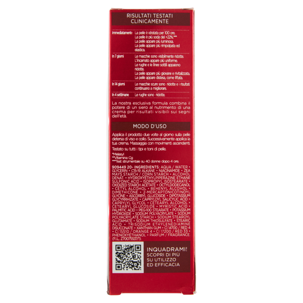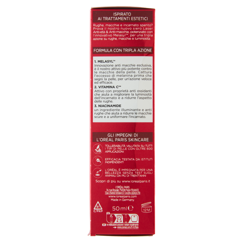 Risultati testati clinicamente - Immediatamente La pelle è idratata per 100 ore. La pelle è più soda del +22%.*** La pelle appare più luminosa. La pelle appare più rimpolpata ed elastica. - In 7 giorni Le macchie sono visibilmente ridotte. L'incarnato appare più uniforme. Le rughe e le linee sottili appaiono ridotte. La pelle appare più giovane e rivitalizzata. La pelle appare distesa, come liftata. - In 14 giorni Le macchie scure sono ridotte e i risultati continuano a migliorare. - In 4 settimane Le rughe sono ridotte. ***Test strumentale su 40 donne dopo 4 ore. La nostra esclusiva formula combina il potere di un siero al nutrimento di una crema per risultati visibili sui segni dell'età. Ispirato ai trattamenti estetici Rughe, macchie e incarnato spento? Prova il nostro nuovo siero Laser Anti-età & Anti-macchie, potenziato con l'innovativo Melasyl, per una tripla azione su rughe, macchie e luminosità. Formula con tripla azione 1. Melasyl Innovazione anti macchie esclusiva, è il nostro attivo più potente contro le macchie della pelle. Cattura l'eccesso di melanina prima che segni la pelle, per un'azione veloce ed efficace. 2. Vitamina C** Attivo con proprietà anti ossidanti che aiuta a migliorare la luminosità dell'incarnato e a ridurre l'aspetto delle rughe. **Vitamina Cg 3. Niacinamide un ingrediente illuminante e anti rughe che aiuta a ridurre le macchie scure e a uniformare l'incarnato.