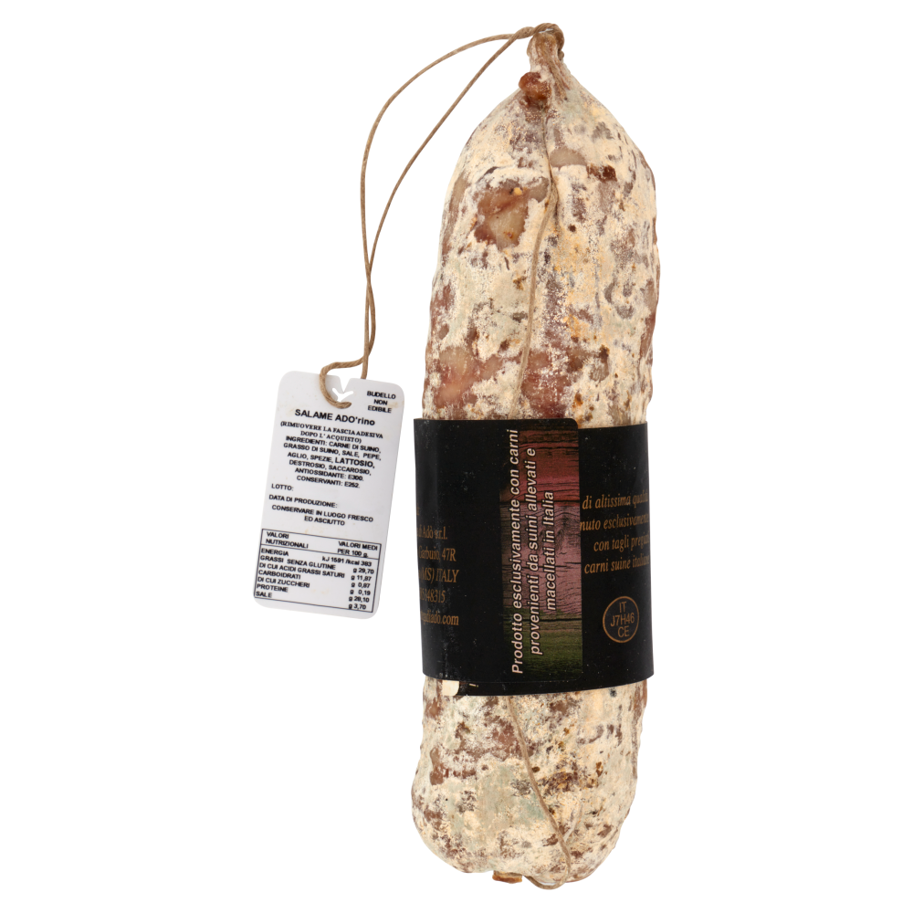 Prodotto esclusivamente con carni provenienti da suini allevati e macellati in Italia Salame di altissima qualità ottenuto esclusivamente con tagli pregiati carni suine italiane