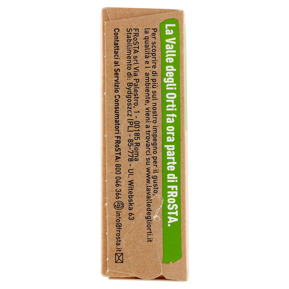 Filiera controllata La trasparenza è il nostro primo ingrediente. La Valle degli Orti garantisce la tracciabilità e la provenienza degli ingredienti. Per saperne di più, visita il sito lavalledegliorti.it/trasparenza La Valle degli Orti fa ora parte di Frosta. Per scoprire di più sul nostro impegno per il gusto, la qualità e l'ambiente, vieni a trovarci su www.lavalledegliorti.it