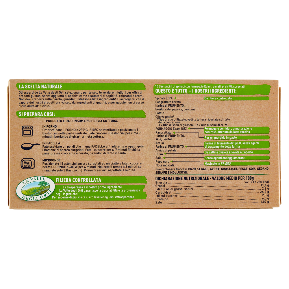 La scelta naturale Gli esperti de La Valle degli Orti selezionano per te solo le verdure migliori per offrirti prodotti gustosi senza aggiunta di additivi come esaltatori dì sapidità, coloranti e aromi. Non devi crederci sulla parola, guarda tu stesso la lista ingredienti! Ti accorgerai che il sapore dei nostri prodotti arriva solo da ingredienti di qualità, e per questo non ci serve alcun aiuto artificiale. Questo è tutto - I nostri ingredienti: Spinaci (31%) - Da filiera controllata Pangrattato dorato (farina di frumento, lievito, sale, paprica, curcuma) Patate Olio vegetale* *Tipo di olio utilizzato, vedi la lettera riportata sul lato della confezione: X = Olio di semi di girasole - Y = Olio di semi si colza Formaggio Edam (8%) - Formaggio semiduro a maturazione naturale, ottenuto da latte vaccino Pangrattato (farina di frumento, sale, lievito) - Per un morbido impasto Acqua Farina di frumento - Farina di frumento di tipo 0, senza agenti di trattamento della farina Amido di patata Uova - Da galline ovaiole allevate all'aperto Sale - Senza agenti antiagglomeranti Pepe nero - Macinato in Frosta Noce moscata