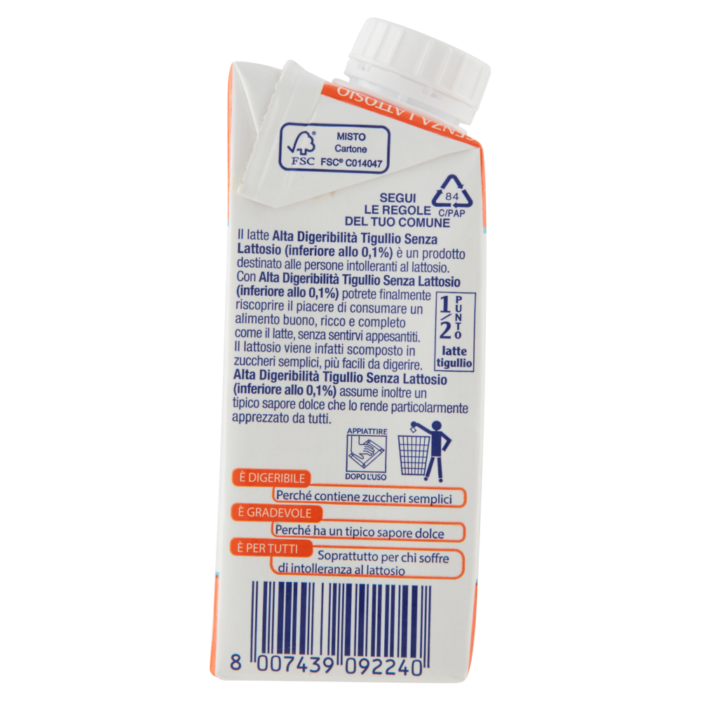 Il latte Alta Digeribilità Tigullio Senza Lattosio (inferiore allo 0,1%) è un prodotto destinato alle persone intolleranti al lattosio. Con Alta Digeribilità Tigullio Senza Lattosio (inferiore allo 0,1%) potrete finalmente riscoprire il piacere di consumare un alimento buono, ricco e completo come il latte, senza sentirvi appesantiti. Il lattosio viene infatti scomposto in zuccheri semplici, più facili da digerire. Alta Digeribilità Tigullio Senza Lattosio (inferiore allo 0,1%) assume inoltre un tipico sapore dolce che lo rende particolarmente apprezzato da tutti. È digeribile Perché contiene zuccheri semplici È gradevole Perché ha un tipico sapore dolce È per tutti Sopratutto per chi soffre di intolleranza al lattosio