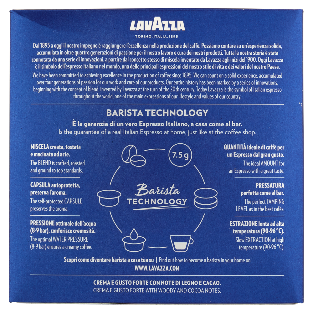 Barista Technology È la garanzia di un vero Espresso Italiano, a casa come al bar. Miscela creata, tostata e macinata ad arte. Quantità ideale di caffè per un Espresso dal gran gusto. Capsula autoprotetta, preserva l'aroma. Pressatura perfetta come al bar. Pressione ottimale dell'acqua (8-9 bar), conferisce cremosità. Estrazione lenta ad alta temperatura (90-96 °C). Scopri come diventare barista a casa tua su www.lavazza.com Crema e gusto forte con note di legno e cacao. Inquadra il QR code e scopri di più su A Modo Mio Crema e Gusto.
