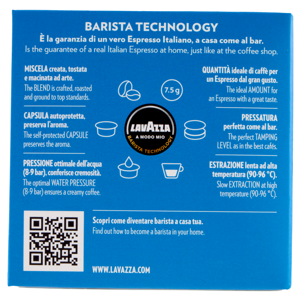 A casa come al bar. Barista technology È la garanzia di un vero Espresso Italiano, a casa come al bar. Miscela creata, tostata e macinata ad arte. Capsula autoprotetta, preserva l'aroma. Pressione ottimale dell'acqua (8-9 bar), conferisce cremosità. Quantità ideale di caffè per un Espresso dal gran gusto. Pressatura perfetta come al bar. Estrazione lenta ad alta temperatura (90-96 °C). Scopri come diventare barista a casa tua. www.lavazza.com