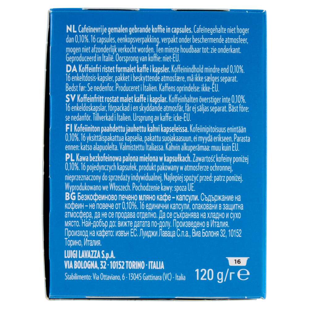 16 capsule monodose di caffè macinato, confezionate in atmosfera protettiva, non vendibili singolarmente. Caffè macinato decaffeinato. Caffeina non superiore allo 0,10%. Le capsule Lavazza A Modo Mio funzionano esclusivamente con il sistema espresso Lavazza A Modo Mio.