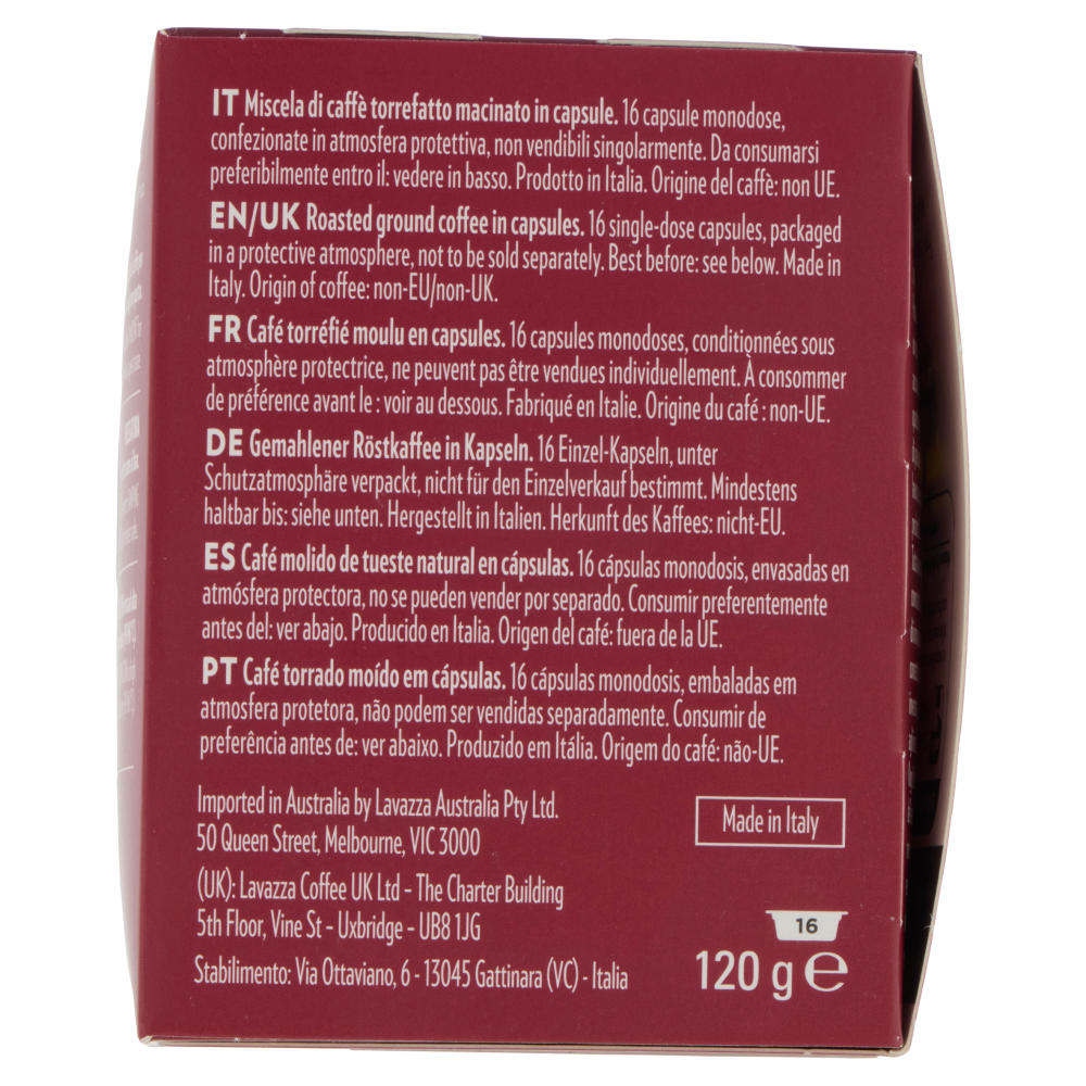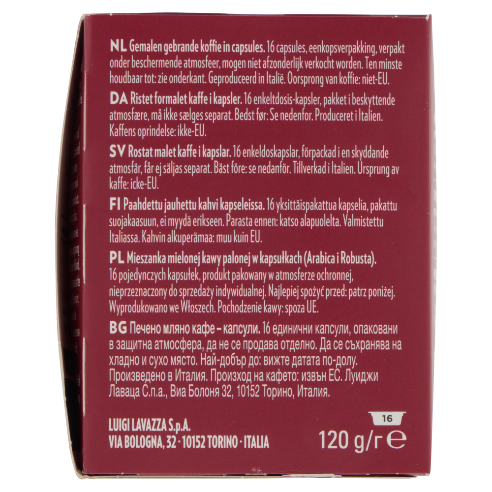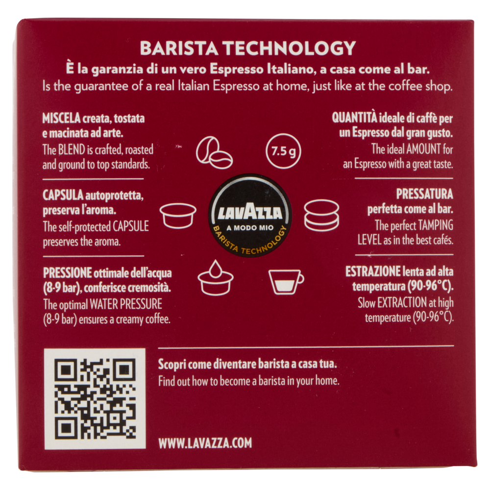 16 capsule monodose di caffè macinato, confezionate in atmosfera protettiva, non vendibili singolarmente. Le capsule Lavazza A Modo Mio funzionano esclusivamente con il sistema espresso Lavazza A Modo Mio.