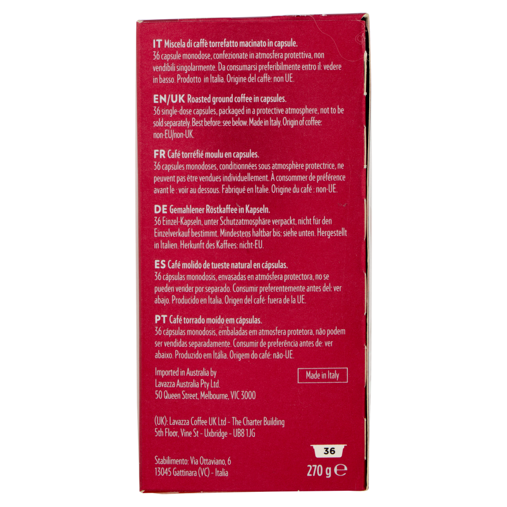 36 capsule monodose di caffè macinato, confezionate in atmosfera protettiva, non vendibili singolarmente. Le capsule Lavazza A Modo Mio funzionano esclusivamente con il sistema espresso Lavazza A Modo Mio.