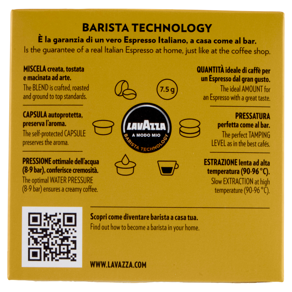 Qualità oro Dal 1956 A casa come al bar. Barista technology È la garanzia di un vero Espresso Italiano, a casa come al bar. Miscela creata, tostata e macinata ad arte. Capsula autoprotetta, preserva l'aroma. Pressione ottimale dell'acqua (8-9 bar), conferisce cremosità. Quantità ideale di caffè per un Espresso dal gran gusto. Pressatura perfetta come al bar. Estrazione lenta ad alta temperatura (90-96 °C). Scopri come diventare barista a casa tua. www.lavazza.com