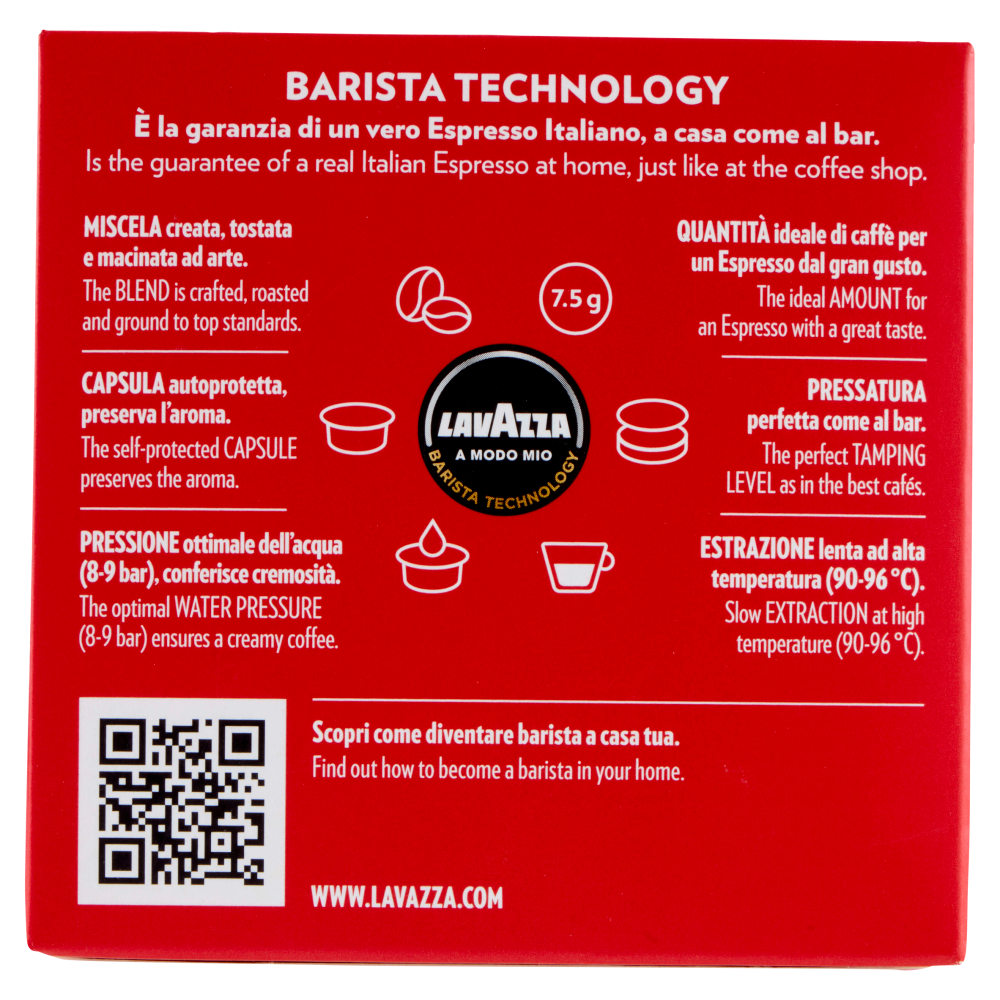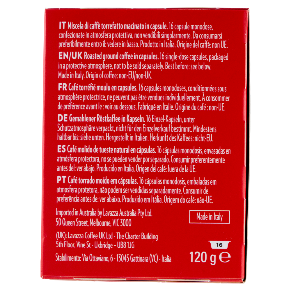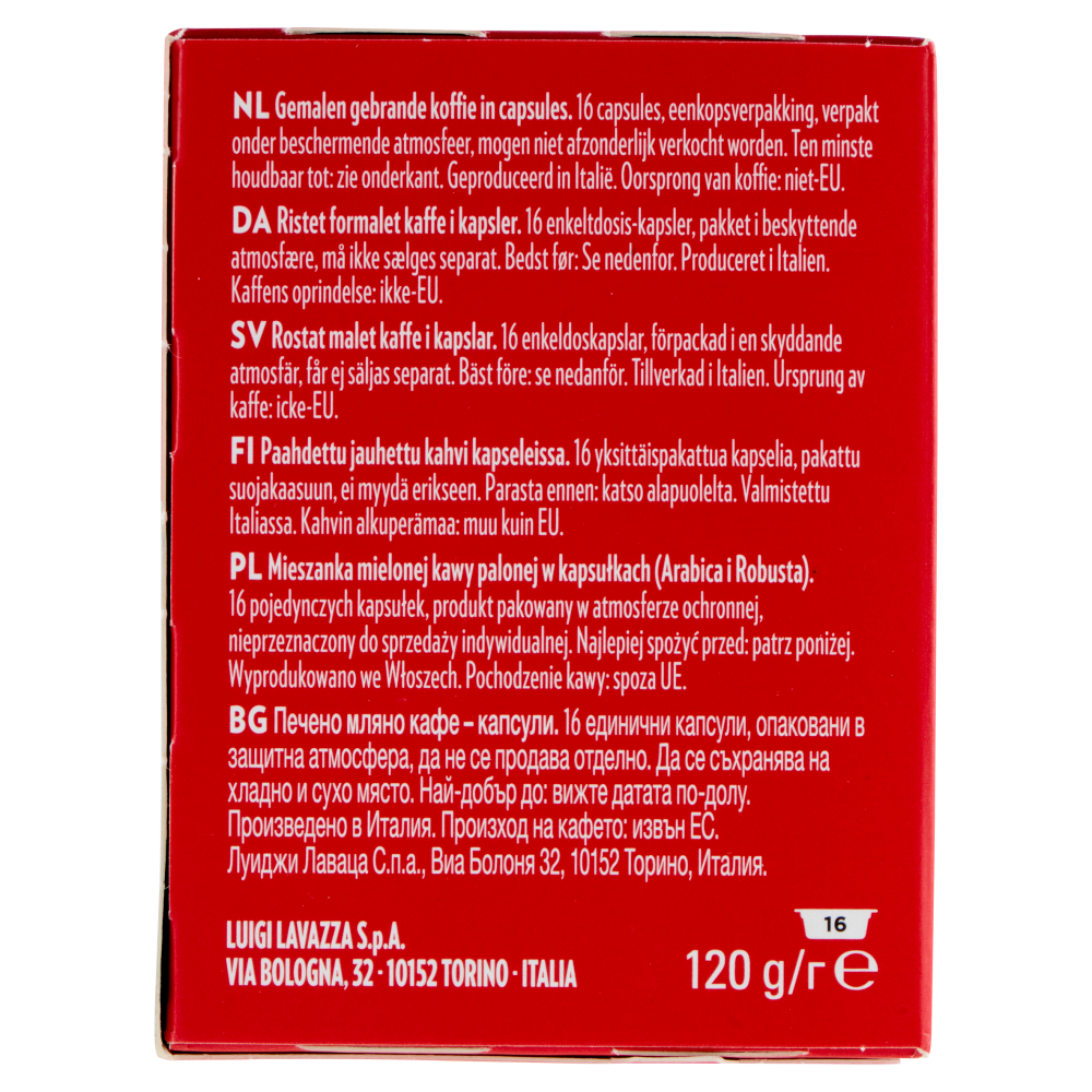 16 capsule monodose di caffè macinato, confezionate in atmosfera protettiva, non vendibili singolarmente. Miscela di caffè macinato. Le capsule Lavazza A Modo Mio funzionano esclusivamente con il sistema espresso Lavazza A Modo Mio.