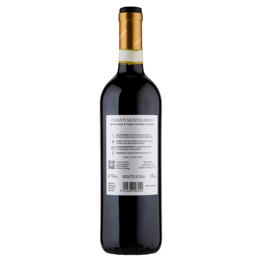 Chianti Montalbano DOCG, vino rosso italiano. Zona di Provenienza: Toscana Zona di Produzione: Territori ben delimitati previsti dal disciplinare di produzione del vino Chianti Montalbano Docg. Carattere: Colore rosso brillante, bouquet ampio con sapore di marasca e viola, sapore asciutto e morbido. Chianti Montalbano Denominazione di Origine Controllata e Garantita