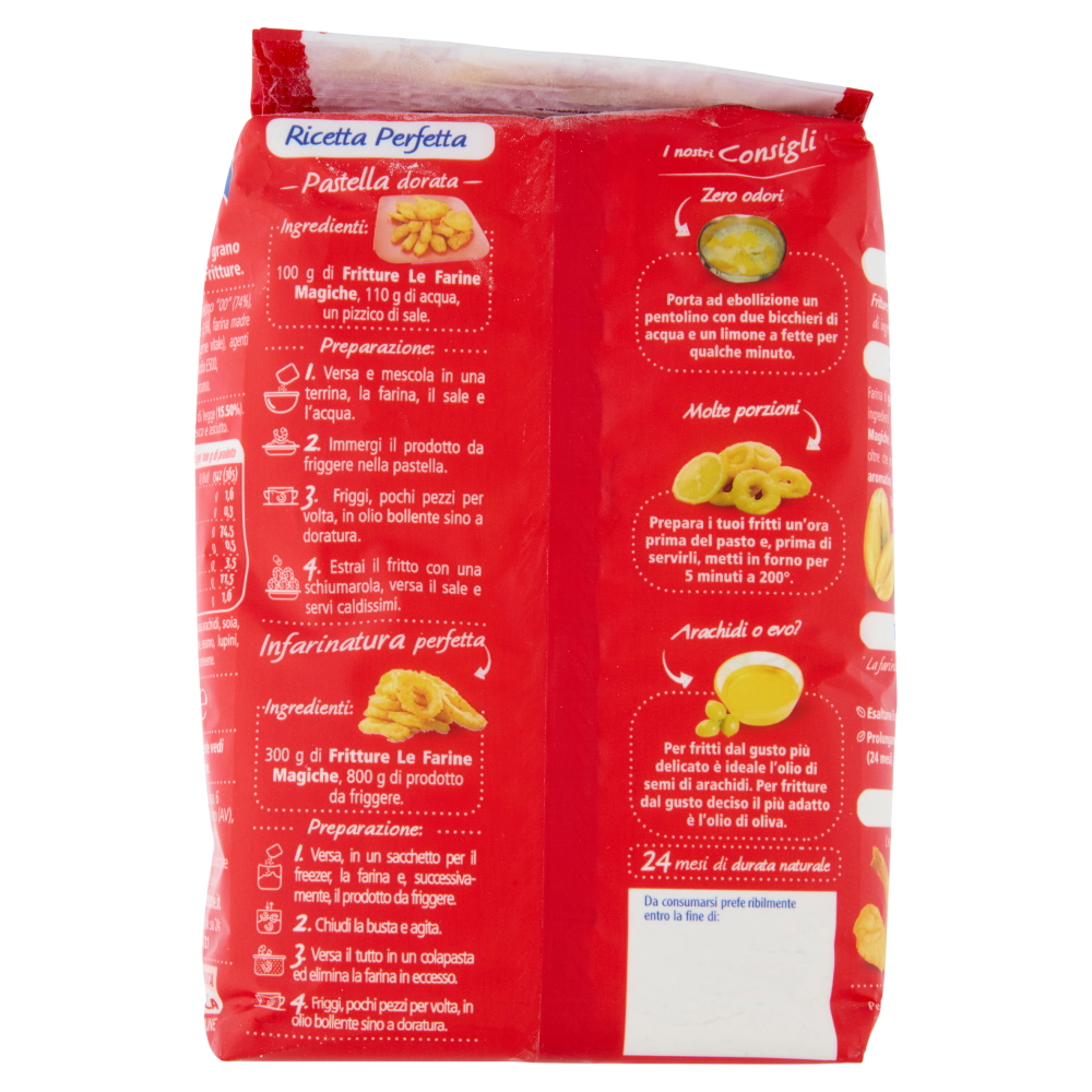 Ideale per Infarinare, pastellare e impasti da friggere (frittelle e altro) Ricetta Lo Conte Fritture è una farina tostata con aggiunta di ingredienti accuratamente selezionati. La nostra selezione Farina di grano tenero e farina di riso sono gli ingredienti principali di Fritture Le Farine Magiche. La farina è realizzata con grani selezionati, oltre che per le sue caratteristiche, per il profilo aromatico, il gusto, il sapore e il colore. La farina di riso rende il fritto croccante e poco unto. L'aggiunta di farina madre rende il fritto più gustoso e saporito, mentre, un pizzico di curcuma dona brio e sapore. Tostatura specifica La farina viene sottoposta ad essiccazione specifica per: - Esaltarne il profilo aromatico - Prolungarne la scadenza (24 mesi). La combinazione L'equilibrio armonico della farina tostata, del riso e del lievito rendono Fritture Le Farine Magiche un prodotto unico. Ogni ingrediente è stato perfettamente dosato per garantirti una frittura croccante, asciutta, dorata e gonfia. Per questo Le Farine Magiche sono fatte bene, per far bene.
