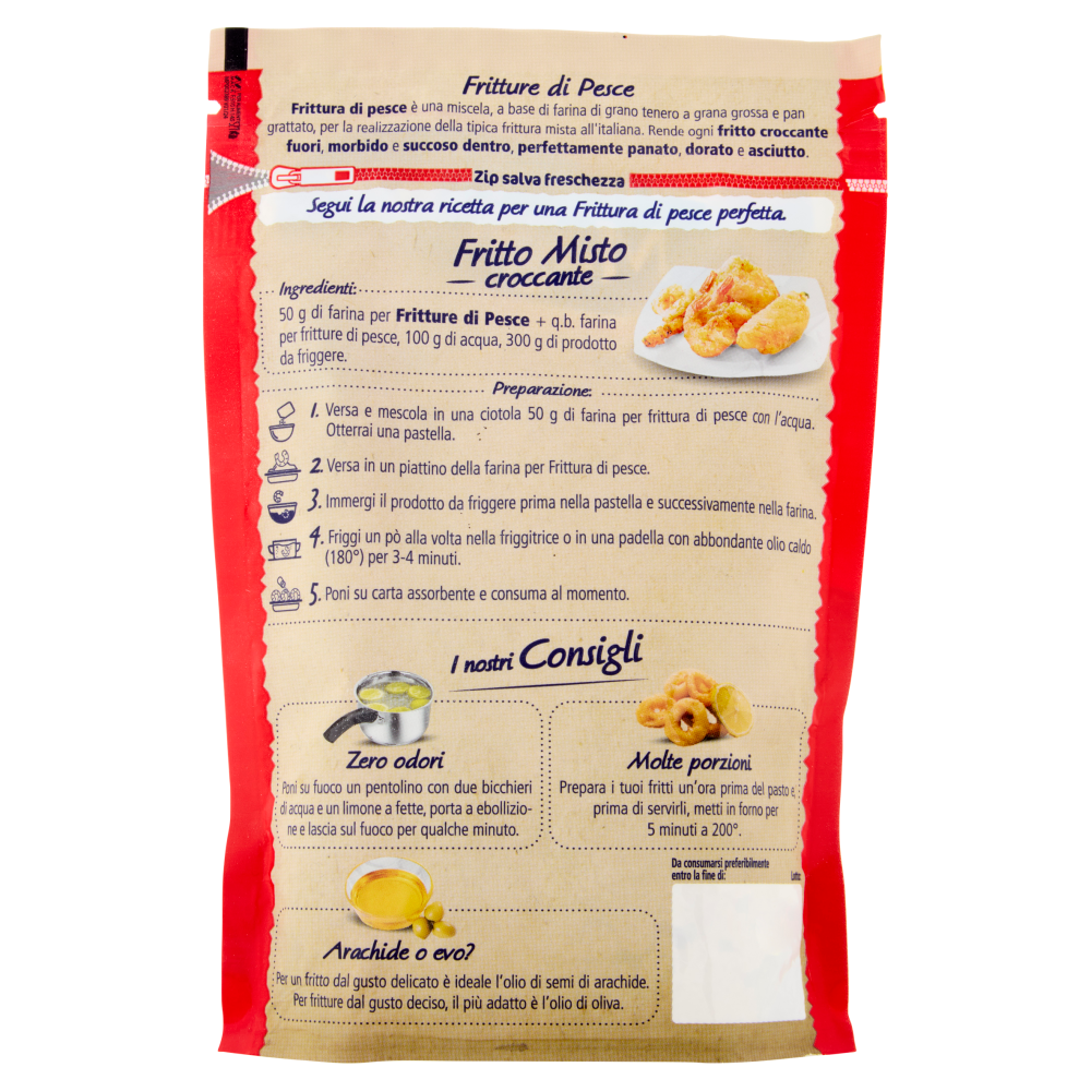 Fritture di Pesce Frittura di pesce è una miscela, a base di farina di grano tenero a grana grossa e pan grattato, per la realizzazione della tipica frittura mista all'italiana. Rende ogni fritto croccante fuori, morbido e succoso dentro, perfettamente panato, dorato e asciutto. Zip salva freschezza