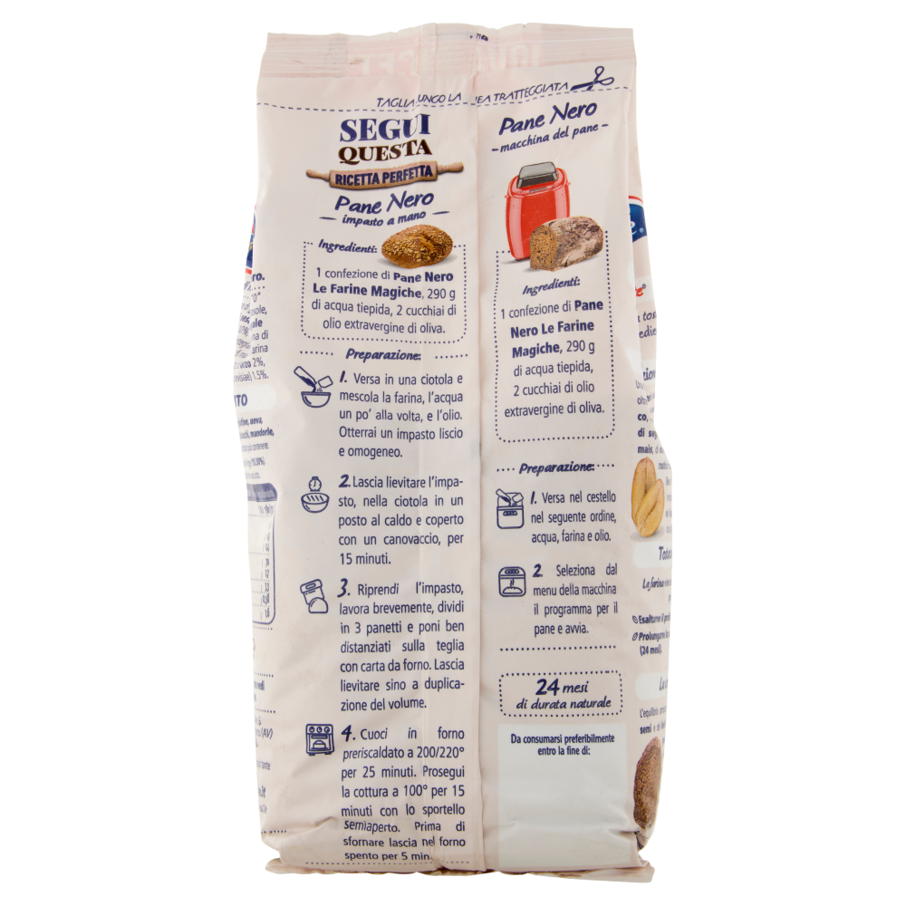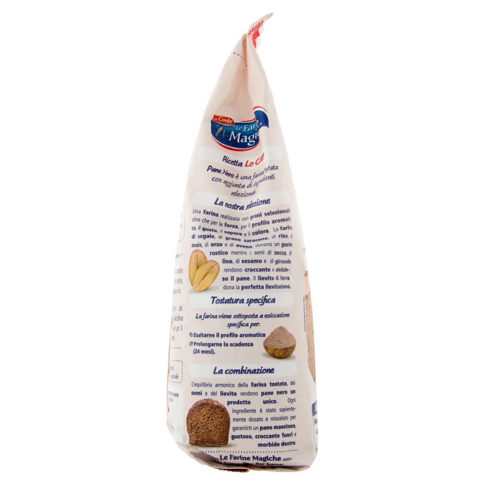 Ricetta Lo Conte Pane Nero è una farina tostata con aggiunta di ingredienti selezionati. La nostra selezione Una farina realizzata con grani selezionati oltre che per la forza, per il profilo aromatico, il gusto, il sapore e il colore. La farina di segale, di grano saraceno, di riso, di mais, di orzo e di avena, donano un gusto rustico mentre i semi di zucca, di lino, di sesamo e di girasole rendono croccante e delizioso il pane. Il lievito di birra dona la perfetta lievitazione. Tostatura specifica La farina viene sottoposta a essiccazione specifica per. - Esaltarne il profilo aromatico - Prolungarne la scadenza (24 mesi). La combinazione L'equilibrio armonico della farina tostata, dei semi e del lievito rendono pane nero un prodotto unico. Ogni ingrediente è stato sapientemente dosato e miscelato per garantirti un pane maestoso, gustoso, croccante fuori e morbido dentro. Per questo Le Farine Magiche sono fatte bene, per far bene.