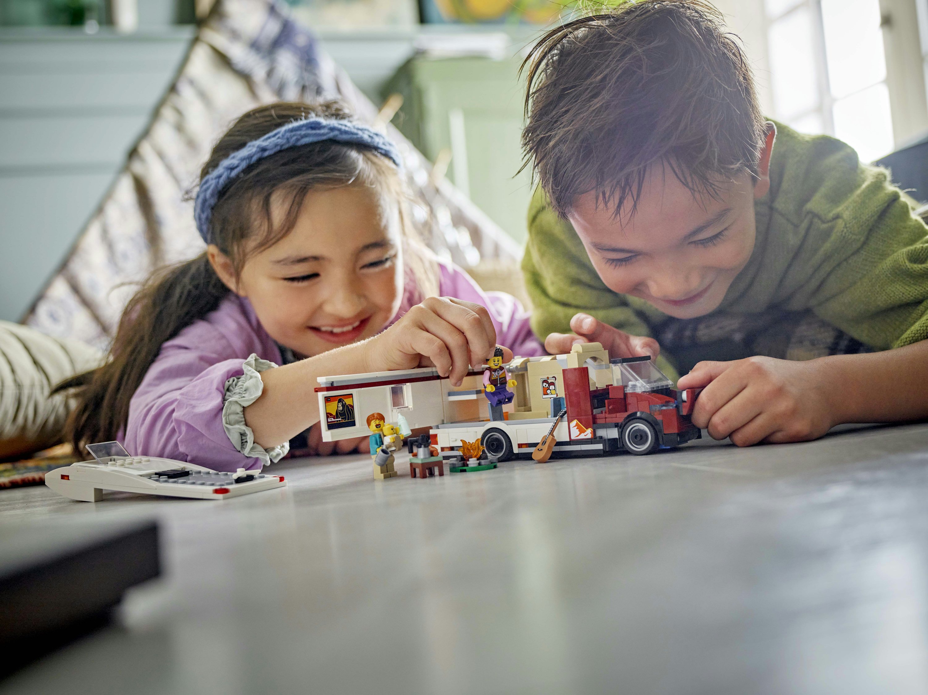 Cosa c’è nella scatola? Questo set con veicolo include tutto ciò di cui i bambini hanno bisogno per costruire un camper con uno spazio abitativo dettagliato, oltre a un falò, 2 minifigure e un bebè