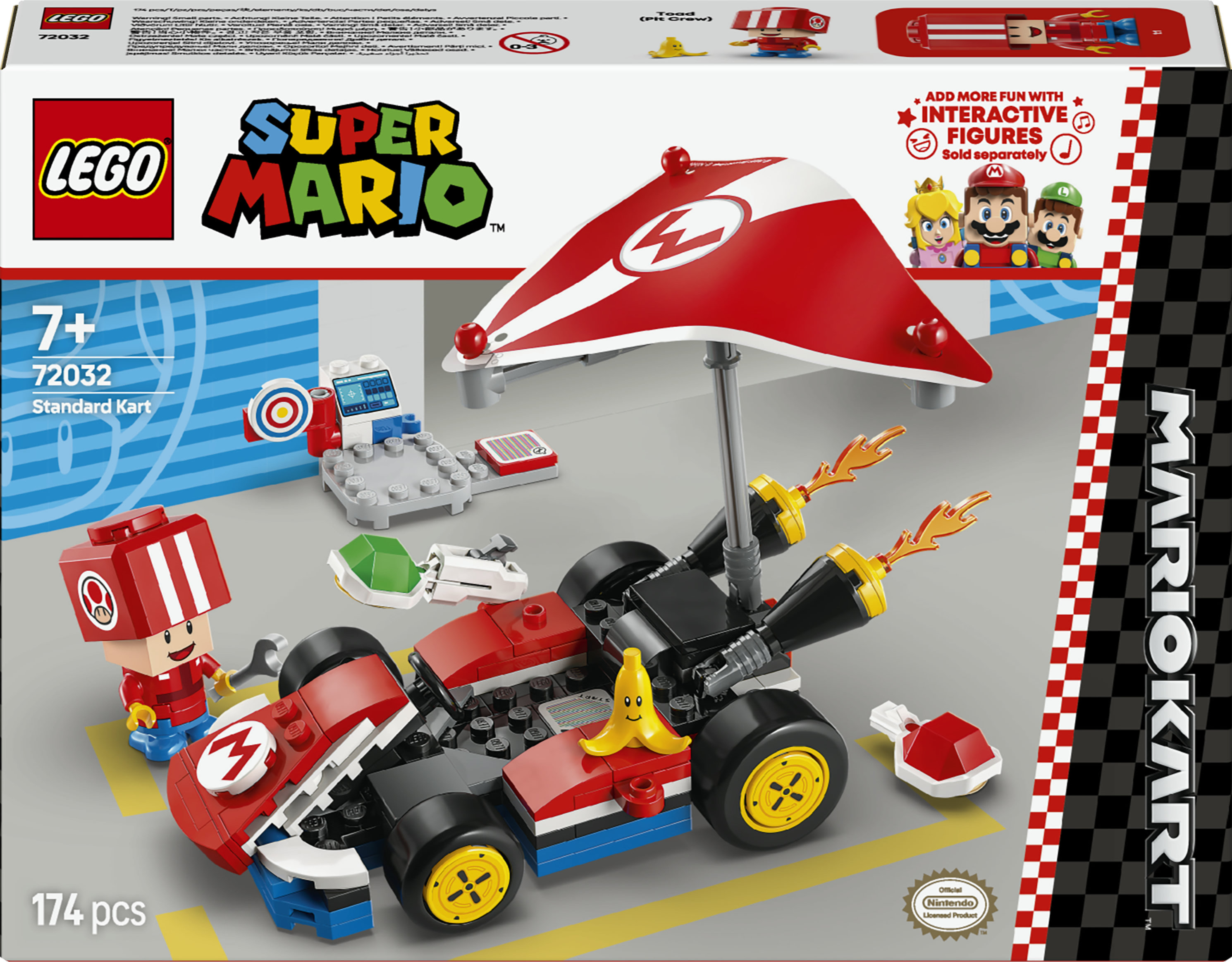 Preparati a gareggiare, derapare e volare sul Kart standard con questo playset per bambini (72032). Un’entusiasmante idea regalo LEGO® Super Mario™ per il compleanno di bambini, bambine e gamer dai 7 anni in su, il set include un modello costruibile del Kart standard di Mario Kart™, una postazione di lavoro con un bersaglio e un personaggio giocattolo di Toad (pit stop) in tuta rossa da meccanico. Il Kart standard è dotato di un Superplani staccabile, ruote da drifting e una funzione di lancio per sparare gusci contro il bersaglio nella postazione di lavoro.