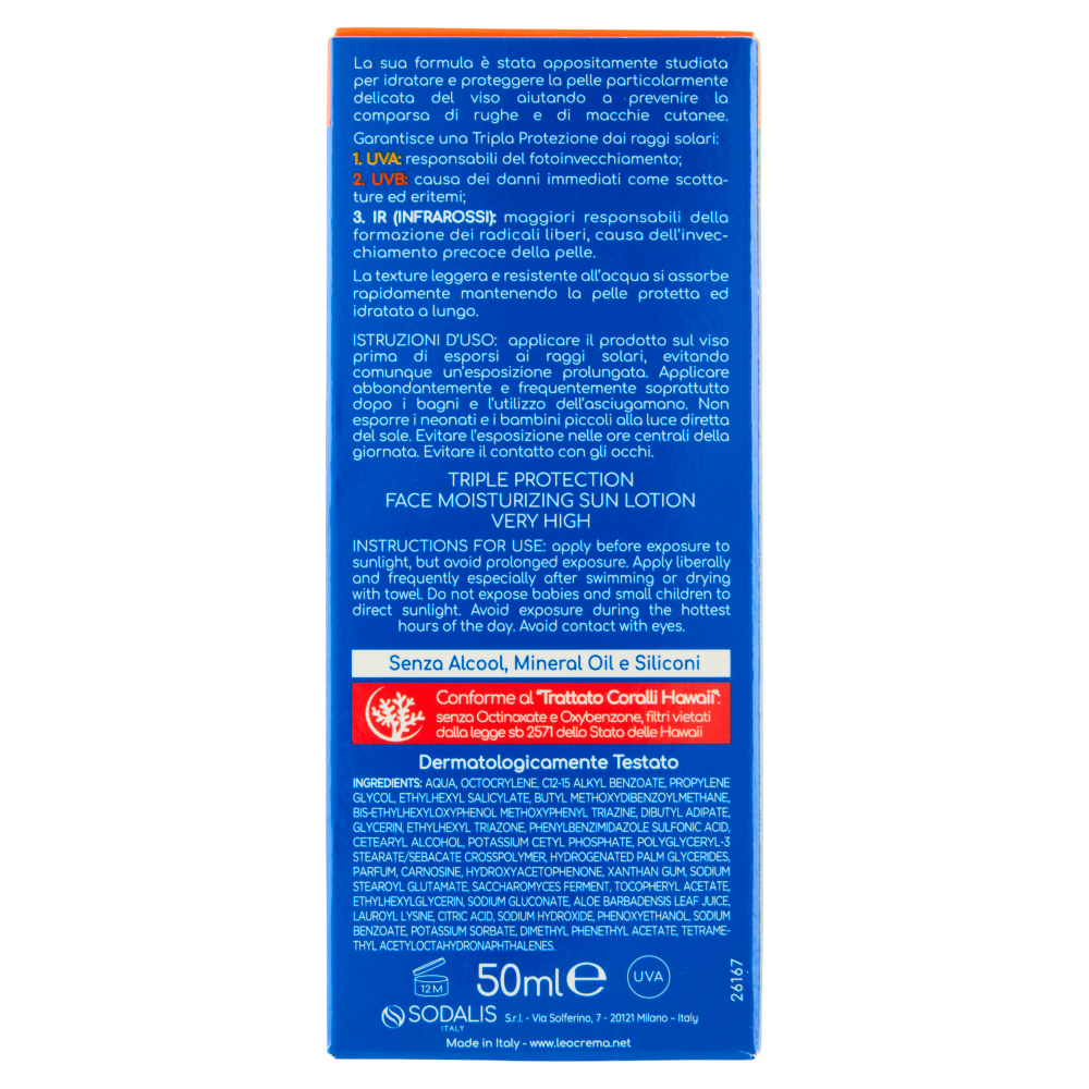Leocrema Solare Tripla Protezione SPF 50+ Molto Alta Crema Solare Viso Idratante 50 ml