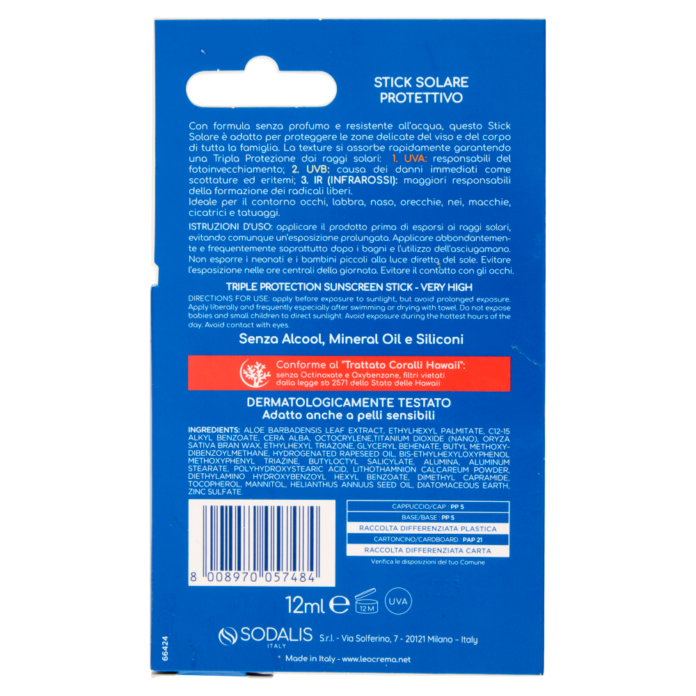 Con formula senza profumo e resistente all'acqua, questo Stick Solare è adatto per proteggere le zone delicate del viso e del corpo di tutta la famiglia. La texture si assorbe rapidamente garantendo una Tripla Protezione dai raggi solari: 1. UVA: responsabili del fotoinvecchiamento; 2. UVB: causa dei danni immediati come scottature ed eritemi; 3. IR (Infrarossi): maggiori responsabili della formazione dei radicali liberi. Ideale per il contorno occhi, labbra, naso, orecchie, nei, macchie, cicatrici e tatuaggi. Senza Alcool, Mineral Oil e Siliconi Conforme al "Trattato Coralli Hawaii": senza Octinoxate e Oxybenzone, filtri vietati dalla legge sb 2571 dello Stato delle Hawaii Dermatologicamente testato Adatto anche a pelli sensibili
