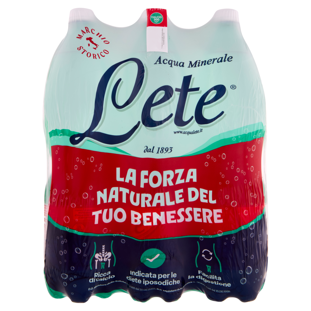Il contenuto di calcio presente nell'acqua minerale naturale Lete partecipa all'integrazione del fabbisogno giornaliero di calcio per la salute delle ossa. D.D. Ministero della Salute n. 4388 del 22.02.2022 Facilita la digestione È indicata per le diete iposodiche Può avere effetti diuretici 100% PET riciclabile In bottiglia come nasce alla fonte Microbiologicamente pura D.P.G.R. Campania n. 25742 del 30.12.1992 1.299 Controlli di qualità ogni giorno.