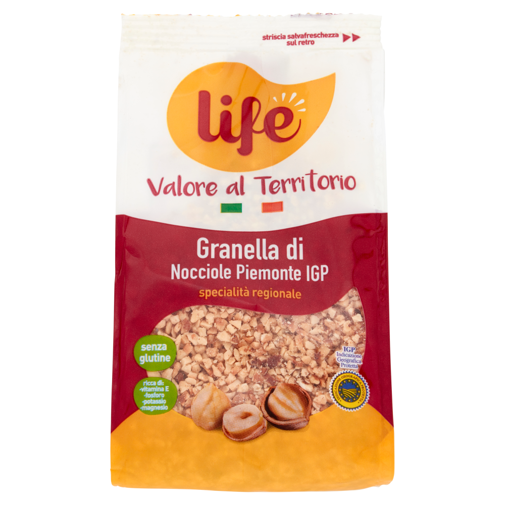 La Granella di Nocciole Piemonte IGP della Linea Valore al Territorio Life è prodotta con nocciole selezionate dalle zone vocate della Regione.