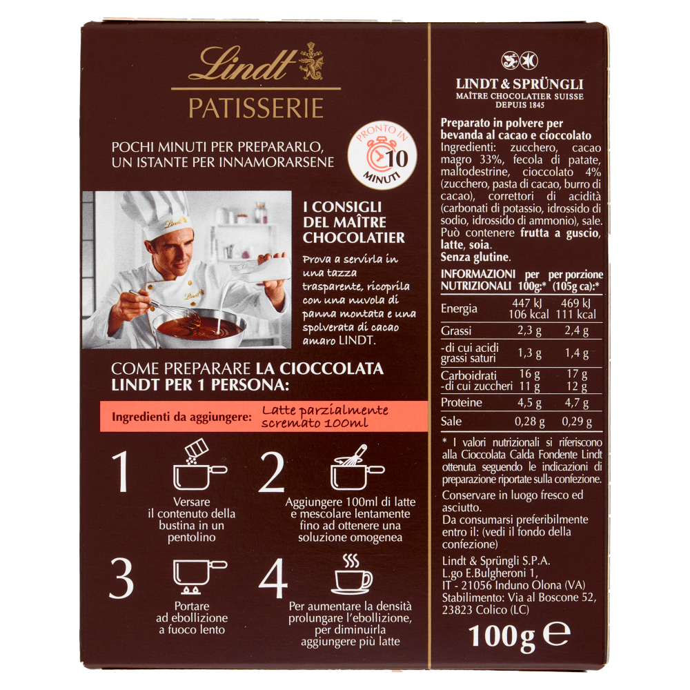 Pronto in 10 minuti I consigli del maître chocolatier Prova a servirla in una tazza trasparente, ricoprila con una nuvola di panna montata e una spolverata di cacao amaro Lindt. Come preparare la cioccolata Lindt per 1 persona: Ingredienti da aggiungere: Latte parzialmente scremato 100ml 1 Versare il contenuto della bustina in un pentolino 2 Aggiungere 100ml di latte e mescolare lentamente fino ad ottenere una soluzione omogenea 3 Portare ad ebollizione a fuoco lento 4 Per aumentare la densità prolungare l'ebollizione, per diminuirla aggiungere più latte