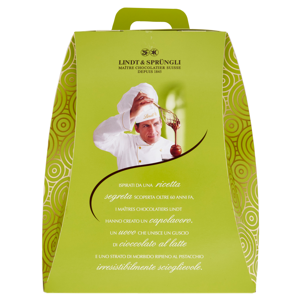 Ispirati da una ricetta segreta scoperta oltre 60 anni fa, i Maîtres Chocolatiers Lindt hanno creato un capolavoro. Un uovo che unisce un guscio di cioccolato al latte e uno strato di morbido ripieno al pistacchio irresistibilmente scioglievole.