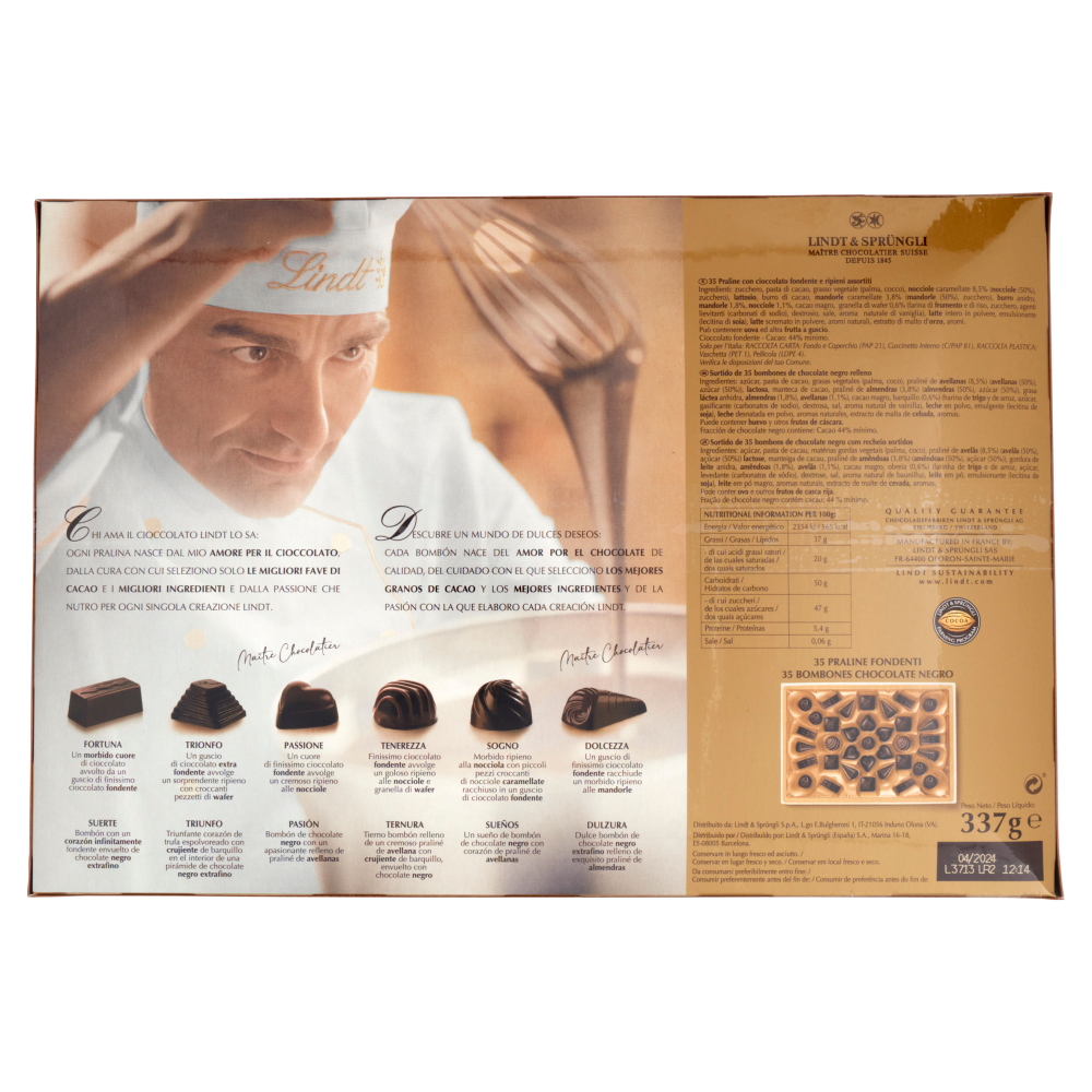 Chi ama il cioccolato Lindt lo sa: Ogni pralina nasce dal mio amore per il cioccolato, dalla cura con cui seleziono solo le migliori fave di cacao e i migliori ingredienti e dalla passione che nutro per ogni singola creazione Lindt. Fortuna Un morbido cuore di cioccolato avvolto da un guscio di finissimo cioccolato fondente Trionfo Un guscio di cioccolato extra fondente avvolge un sorprendente ripieno con croccanti pezzetti di wafer Passione Un cuore di finissimo cioccolato fondente avvolge un cremoso ripieno alle nocciole Tenerezza Finissimo cioccolato fondente avvolge un goloso ripieno alle nocciole e granella di wafer Sogno Morbido ripieno alla nocciola con piccoli pezzi croccanti di nocciole caramellate racchiuso in un guscio di cioccolato fondente Dolcezza Un guscio di finissimo cioccolato fondente racchiude un morbido ripieno alle mandorle 35 Praline