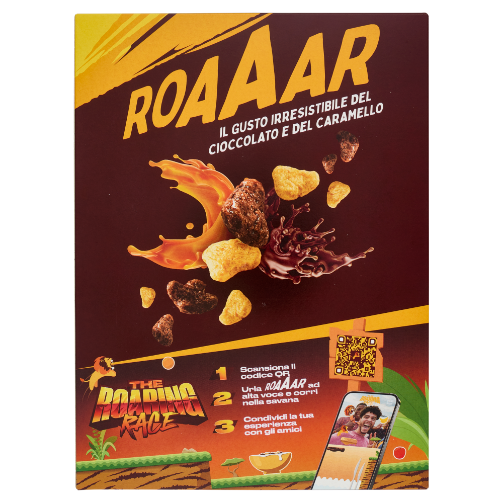 Roaaar Il gusto irresistibile del cioccolato e del caramello The roaring race 1 Scansiona il codice QR 2 Urla Roaaar ad alta voce e corri nella savana 3 Condividi la tua esperienza con gli amici Provali anche in barretta - 13 Colazioni - Cereali Integrali - Ingrediente N°1