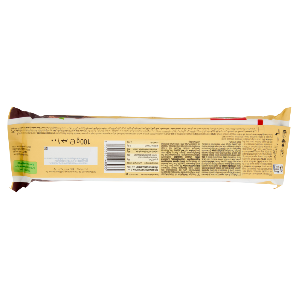 Pasticcini di wafer fragranti con crema al cioccolato fondente (47%) e granella di nocciole, ricoperti di cioccolato fondente (28%) e cioccolato al latte (8%)