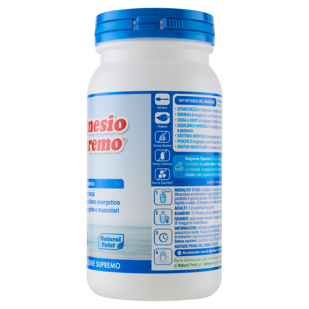 Magnesio Supremo è la formula originale ed esclusiva di Natural Point, costituita da acido citrico di origine vegetale e Magnesio di origine marina. La miscela in acqua si trasforma in una soluzione ad alto contenuto di magnesio citrato, sale organico altamente solubile con elevata velocità di assorbimento. scopri la Linea su magnesiosupremo.it