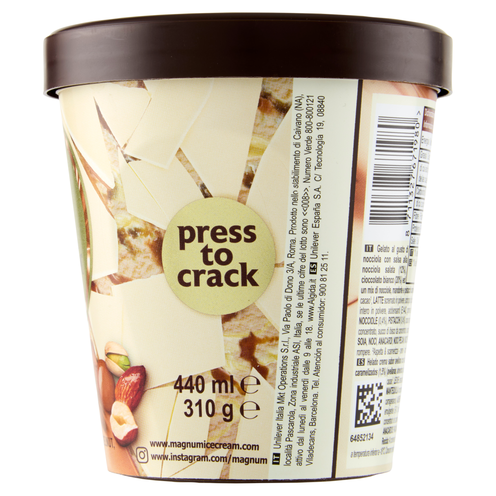 Gelato al gusto di nocciola con salsa alla nocciola salata (12%), cioccolato bianco (20%) ed un mix di nocciole, mandorle e pistacchi caramellizzati (1,5%)