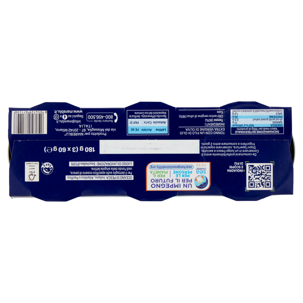 Zona di pesca Oceano di pesca: Indiano, Atlantico o Pacifico. Per il dettaglio sullo specifico oceano di pesca, vedi fondo della singola lattina Origine Altro Testo Luogo di lavorazione: Seychelles (FC01)