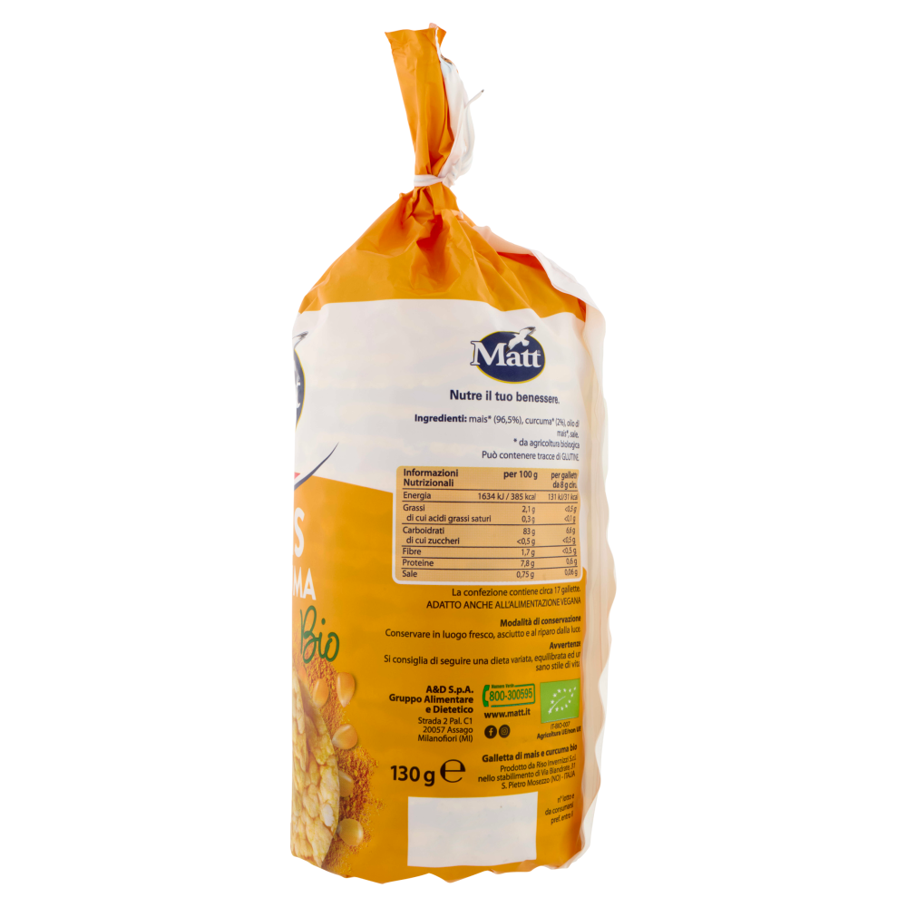 Le Mais Curcuma Bio Sono croccantissime gallette prodotte con il meglio del mais, arricchite dalla presenza della curcuma, da sempre nota per le sue proprietà digestive e antiossidanti, per un'assoluta esplosione di gusto. Senza lievito e a basso contenuto di grassi, sono un valido aiuto per chi vuole alimentarsi in modo sano e mantenersi in forma. Sono un'alternativa completa e gustosa e possono essere consumate in qualsiasi momento della giornata come snack stuzzicante. ...Non Solo Bio - Prodotto Vegetale - Senza Lievito - A basso contenuto di Grassi Adatto anche all'alimentazione vegana Avvertenze Si consiglia di seguire una dieta variata, equilibrata ed un sano stile di vita.
