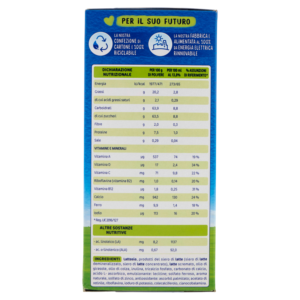 Con nutrienti importanti per la crescita* del tuo bambino - *Fonte di calcio e vitamina D che contribuiscono al sano sviluppo di ossa e denti - *Fonte di ferro e iodio che contribuiscono al normale sviluppo cognitivo - *Con ALA (Omega 3) che contribuisce allo sviluppo cerebrale e dei nervi - *Con vitamina B2 che contribuisce al normale metabolismo energetico - Con vitamine A,C,D che supportano il normale funzionamento del sistema immunitario - Apporto proteico adattato alle sue esigenze nutrizionali - Solo lo zucchero del latte - Senza olio di palma - Senza coloranti e conservanti** **Come per legge Per il suo futuro La nostra confezione di cartone è 100% riciclabile La nostra fabbrica è alimentata al 100% da energia elettrica rinnovabile