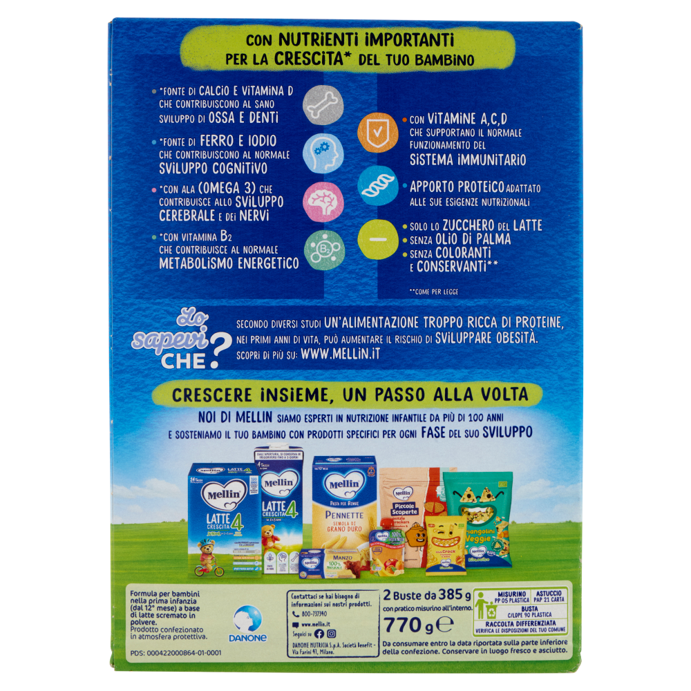 Mellin 100 Anni di ricerca dedicata alla nutrizione infantile Lo sapevi Che? Secondo diversi studi un'alimentazione troppo ricca di proteine, nei primi anni di vita, può aumentare il rischio di sviluppare obesità. Scopri di più su: www.mellin.it Crescere insieme, un passo alla volta Noi di Mellin siamo esperti in nutrizione infantile da più di 100 anni e sosteniamo il tuo bambino con prodotti specifici per ogni fase del suo sviluppo
