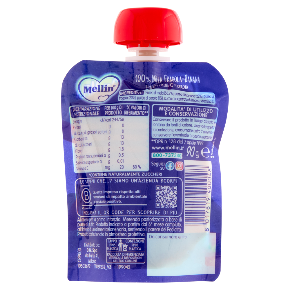 MELLIN Merenda di Frutta 100% con Carota e Vit C, Mela Fragola e Banana, dal 6° mese, Pouch 90 g
