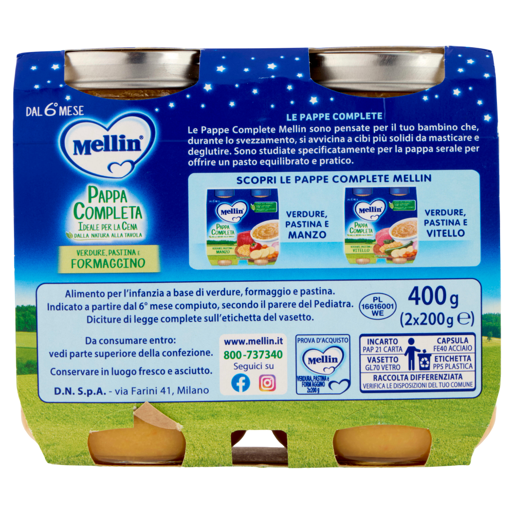MELLIN Pappa Completa ideale per la Cena, Pastina Verdure Formaggino, dal 6° mese, 2x200g