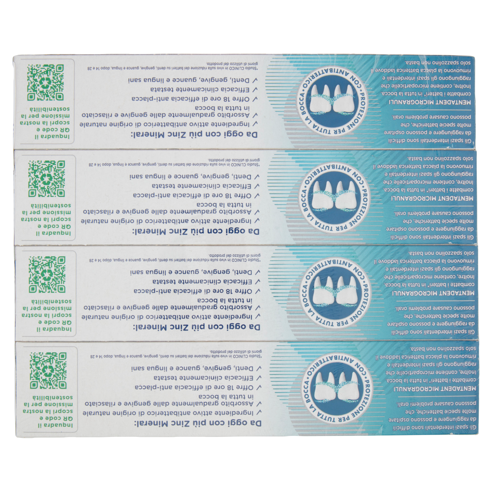 Gli spazi interdentali sono difficili da raggiungere e possono ospitare molte specie batteriche, che possono causare problemi orali. Mentadent Microgranuli combatte i batteri* in tutta la bocca. Inoltre, contiene microparticelle che raggiungono gli spazi interdentali e rimuovono la placca batterica laddove il solo spazzolino non basta. Da oggi con più Zinc Mineral: - Ingrediente attivo antibatterico di origine naturale - Assorbito gradualmente dalle gengive e rilasciato in tutta la bocca - Offre 18 ore di efficacia anti-placca - Efficacia clinicamente testata - Denti, gengive, guance e lingua sani *Studio Clinico in vivo sulla riduzione dei batteri su denti, gengive, guance e lingua, dopo 14 e 28 giorni di utilizzo del prodotto. Approvato ANDI - Associazione Nazionale Dentisti Italiani L'A.N.D.I. riconosce che un dentifricio al fluoro correttamente formulato aiuta a prevenire la formazione della placca proteggendo la salute di denti e gengive. Mentadent Microgranuli soddisfa questi requisiti ed è quindi di significativa utilità, unito ad una sostituzione regolare dello spazzolino e ad un suo corretto utilizzo. FDI World Dental Federation FDI riconosce che lavarsi i denti almeno due volte al giorno con un dentifricio al fluoro, come Mentadent Microgranuli, è di significativa utilità per una corretta igiene orale.