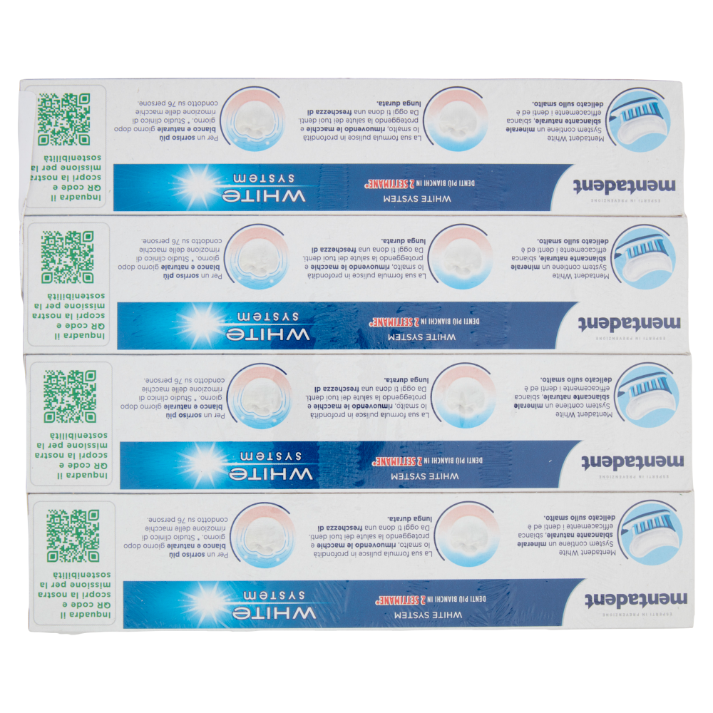 White System Denti più bianchi in 2 settimane* Mentadent White System contiene un minerale sbiancante naturale, sbianca efficacemente i denti ed è delicato sullo smalto. La sua formula pulisce in profondità lo smalto, rimuovendo le macchie e proteggendo la salute dei tuoi denti. Da oggi ti dona una freschezza di lunga durata. Per un sorriso più bianco e naturale giorno dopo giorno. *Studio clinico di rimozione delle macchie condotto su 76 persone. Approvato ANDI - Associazione Nazionale Dentisti Italiani L'A.N.D.I riconosce che un dentifricio al fluoro aiuta a prevenire la formazione della placca proteggendo la salute di denti e gengive. Mentadent White System soddisfa questi requisiti ed è quindi di significativa utilità, unito ad una sostituzione regolare dello spazzolino e ad un suo corretto utilizzo.
