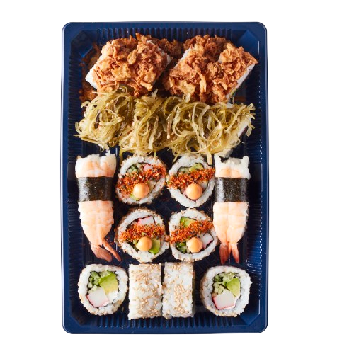 18 pezzi: 4 Crunch Cali Roll, 4 Wakame Cali Roll, 4 Spicy Cali Roll, 4 Cheese Cali Roll, 2 Nigiri di gambero