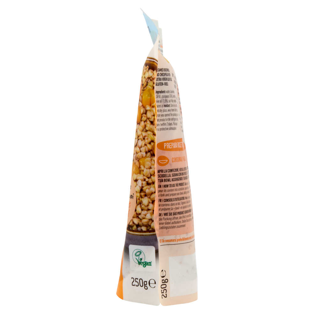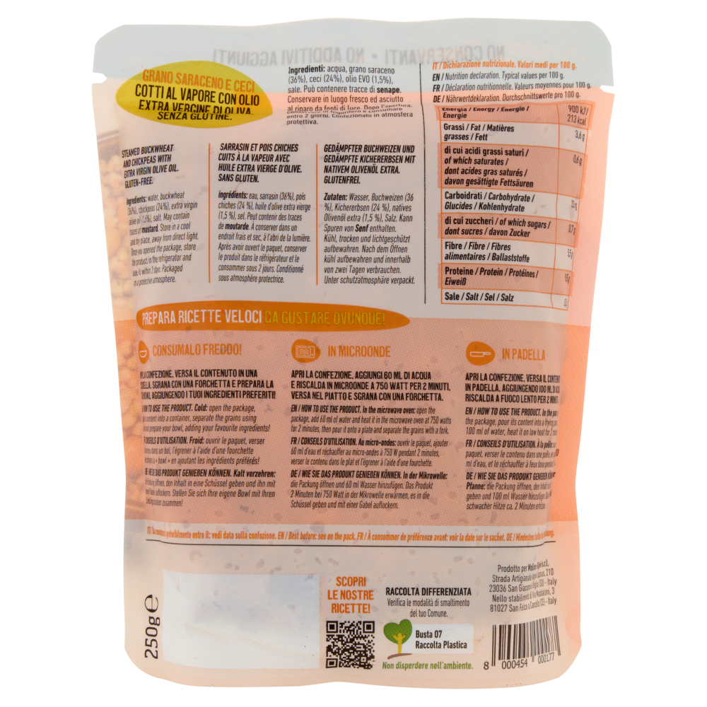 Adatto ai veganiGrano saraceno e ceci cotti al vapore con olio extra vergine di oliva. Senza glutine