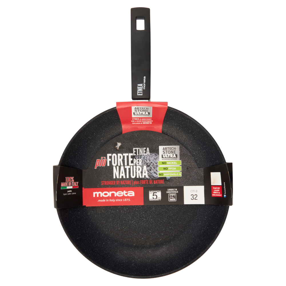 Padella 32 cm; corpo in alluminio alto spessore fondo 4 mm; rivestimento interno Artech Stone Ultra effetto pietra, triplo rivestimento antiaderente rinforzato con particelle minerali;esterno effetto pietra Hardoise