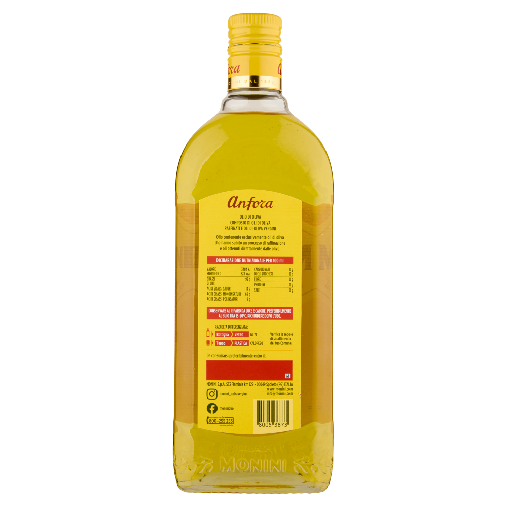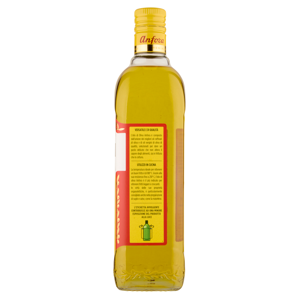 Versatile e di qualità L'olio di Oliva Anfora è composto dall'unione dei migliori oli raffinati di oliva e di oli vergini di oliva di qualità, selezionati per dare un gusto delicato che non altera il sapore degli alimenti, sia in frittura che in cottura. Utilizzo in cucina La temperatura ideale per ottenere un buon fritto è di 180° C. Grazie alla sua resistenza fino a 210° C, l'olio di oliva Anfora è il più indicato per ottenere fritti leggeri e croccanti. In virtù delle sue proprietà organolettiche, è particolarmente consigliato anche nella preparazione di sughi e salse, come la maionese. L'etichetta avvolgente contribuisce ad una minore esposizione del prodotto alla luce.